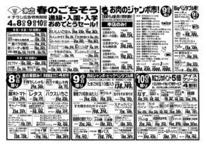 4月8日から4月14日のチラシは「春のごちそう。進級・入園・入学おめでとうセール!新パーティー寿司842円」