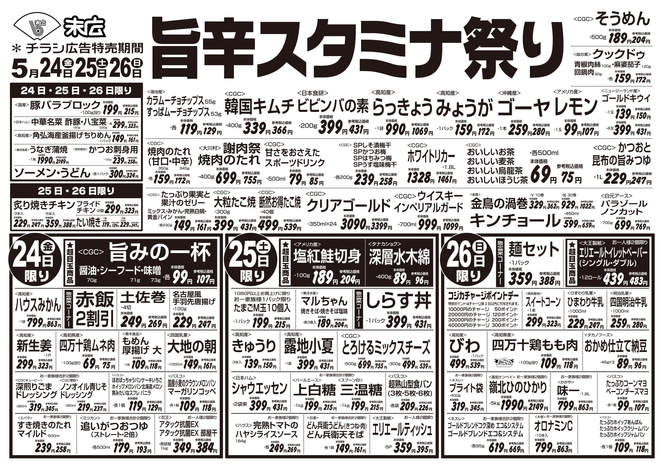 【末広チラシ情報】ネットでチラシを確認できます。 5月24日~5月30日のチラシは「旨辛スタミナ祭り 豚バラブロック 215円」 詳細版PDFはこちら(1.4MB) チラシ情報 この記事が気に入ったら いいね または フォローしてね! Follow @suehiloya Follow Me よかったらシェアしてね! URLをコピーしました! URLをコピーしました! 5月17日~5月23日のチラシは「旬を漬けよう らっきょう酢 474円」 5月31日~6月6日のチラシは「初夏の味覚 タコ刺身用 323円」 関連記事 10月17日~10月23日のチラシは「秋の土用スタミナメニュー 生さんま 626円」 2025年10月16日 高知新聞で「田舎寿司せっと」が紹介されました! 2025年10月16日 9月5日~9月11日のチラシは「秋のうまかもん祭り 本マグロ刺身用 755円」 2025年9月4日 8月29日~9月4日のチラシは「家計応援! 総力祭 トラウトサーモン 215円」 2025年8月28日 8月22日~8月28日のチラシは「初秋の味わい・秋の新商品 生さんま1尾 215円」 2025年8月21日 8月15日~8月21日のチラシは「夏のスタミナ飯特集 北海道産 無添加ほっけ開き 410円」 2025年8月14日 仕出しのメニューを更新しました。(2025年8月) 2025年8月8日 8月8日~8月14日のチラシは「お盆のごちそう 海鮮BBQセット 863円」 2025年8月7日