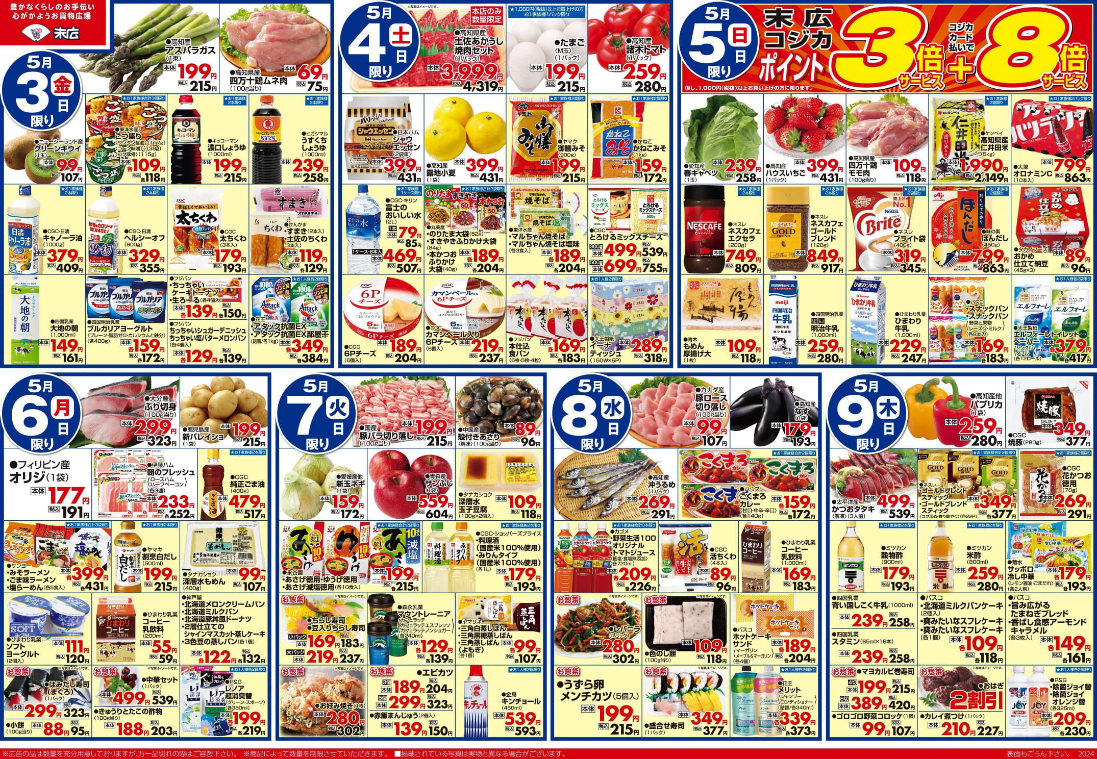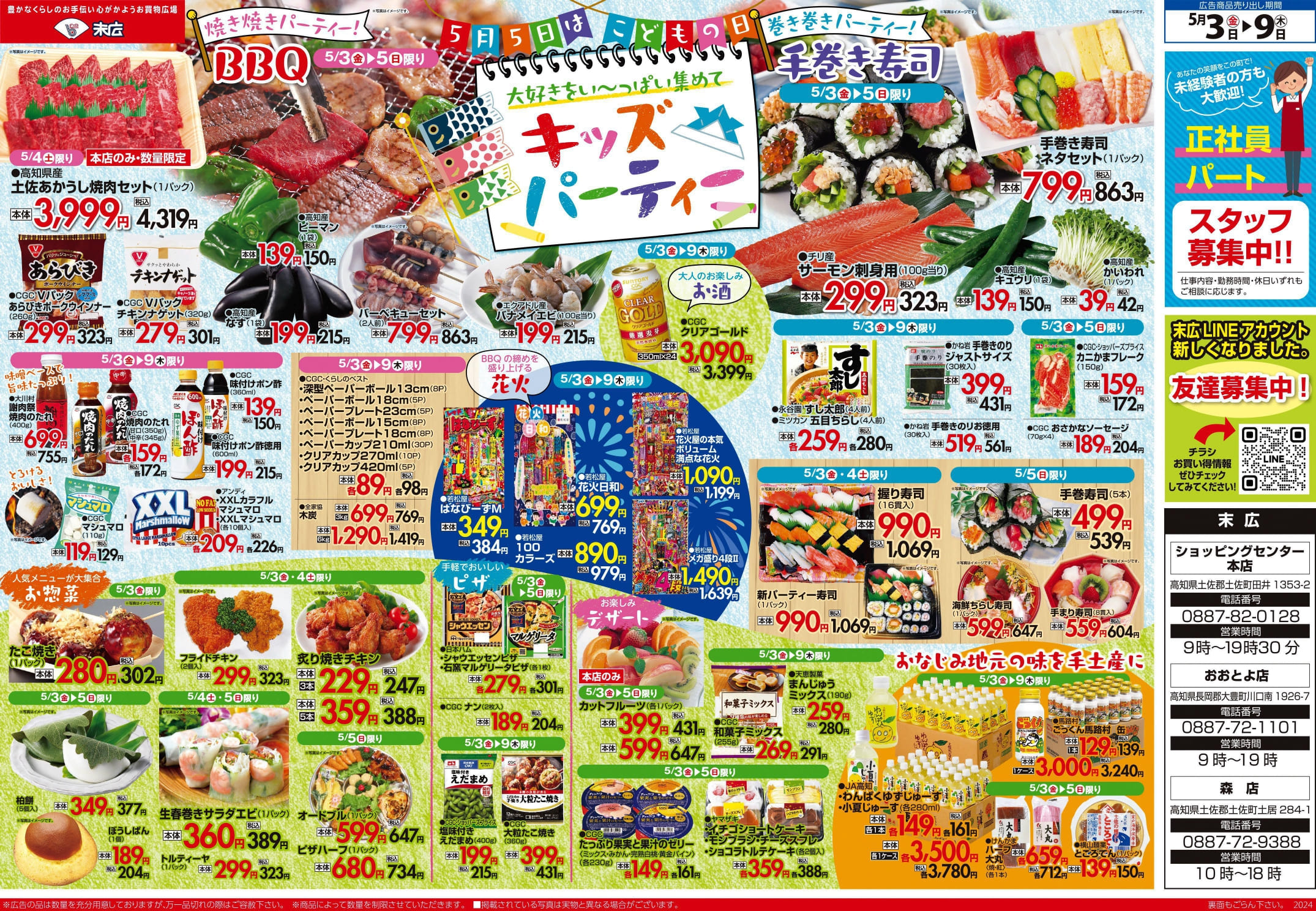 【末広チラシ情報】ネットでチラシを確認できます。 5月3日~5月9日のチラシは「大好きをい~っぱい集めてキッズパーティー 手巻き寿司ネタセット 863円」 詳細版PDFはこちら(1.5MB) チラシ情報 この記事が気に入ったら いいね または フォローしてね! Follow @suehiloya Follow Me よかったらシェアしてね! URLをコピーしました! URLをコピーしました! 4月26日~5月2日のチラシは「GWごちそうメニュー! 土佐あかうしロース焼肉〈解凍〉 1295円」 5月10日~5月16日のチラシは「ごちそうでママを笑顔に 牛肩ロースステーキ 269円」 関連記事 10月24日~10月30日のチラシは「おうちでハロウィンしよ サーモン刺身用 388円」 2025年10月23日 10月17日~10月23日のチラシは「秋の土用スタミナメニュー 生さんま 626円」 2025年10月16日 高知新聞で「田舎寿司せっと」が紹介されました! 2025年10月16日 9月5日~9月11日のチラシは「秋のうまかもん祭り 本マグロ刺身用 755円」 2025年9月4日 8月29日~9月4日のチラシは「家計応援! 総力祭 トラウトサーモン 215円」 2025年8月28日 8月22日~8月28日のチラシは「初秋の味わい・秋の新商品 生さんま1尾 215円」 2025年8月21日 8月15日~8月21日のチラシは「夏のスタミナ飯特集 北海道産 無添加ほっけ開き 410円」 2025年8月14日 仕出しのメニューを更新しました。(2025年8月) 2025年8月8日