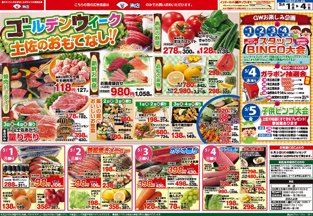 5月1日から5月4日のチラシは「ゴールデンウィーク土佐のおもてなし。お刺身盛り合わせ980円」