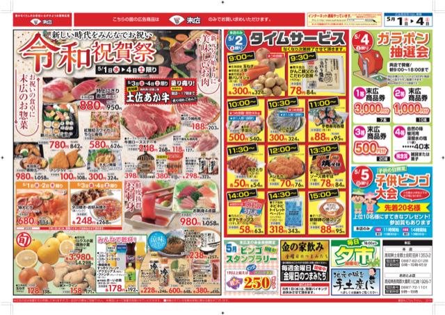5月1日から5月4日のチラシは「新しい時代をみんなでお祝い。令和祝賀祭。特上にぎり寿司880円」