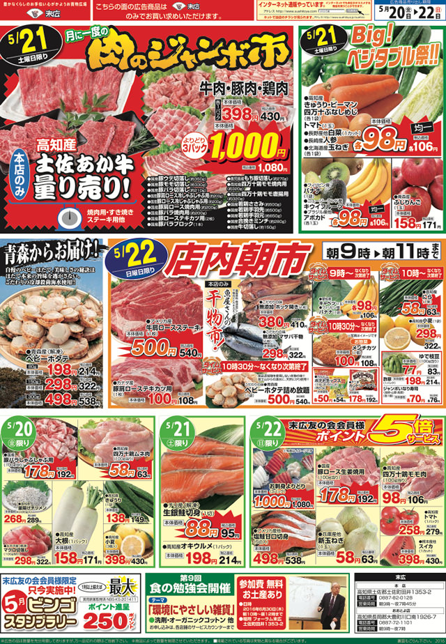 5月20日から5月22日のチラシは「月に一度の肉のジャンボ市。牛肉・豚肉・鶏肉よりどり3パック1,000円」