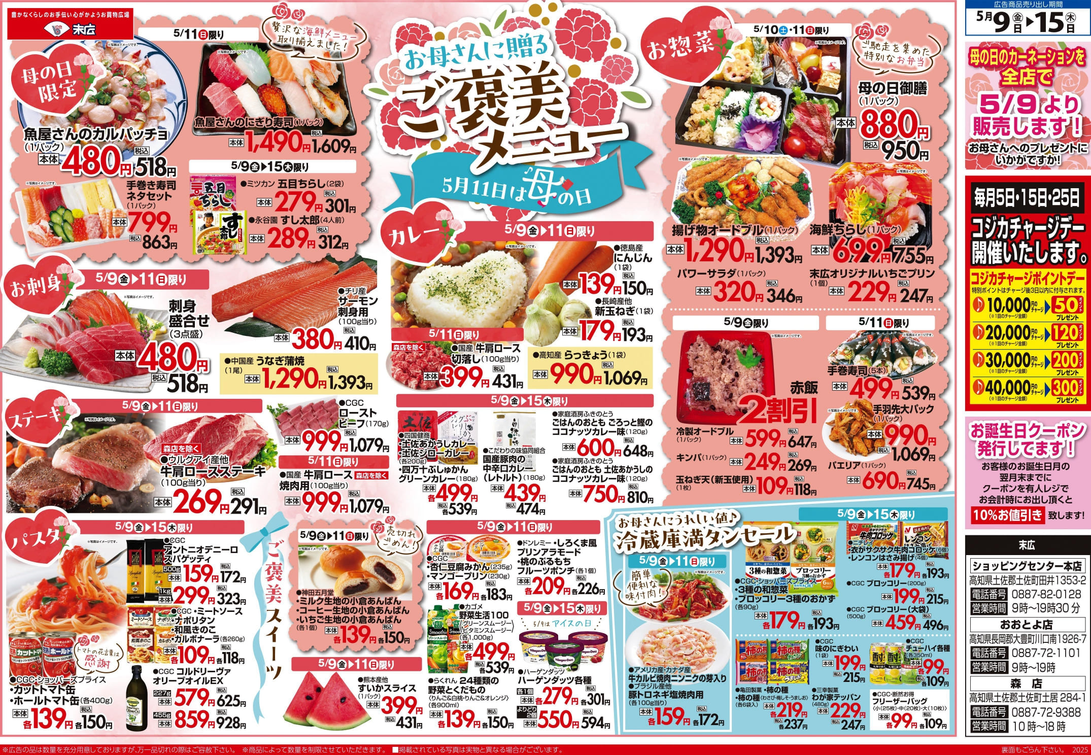 5月9日~5月15日のチラシは「お母さんに贈るご褒美メニュー 刺身盛合せ 518円」