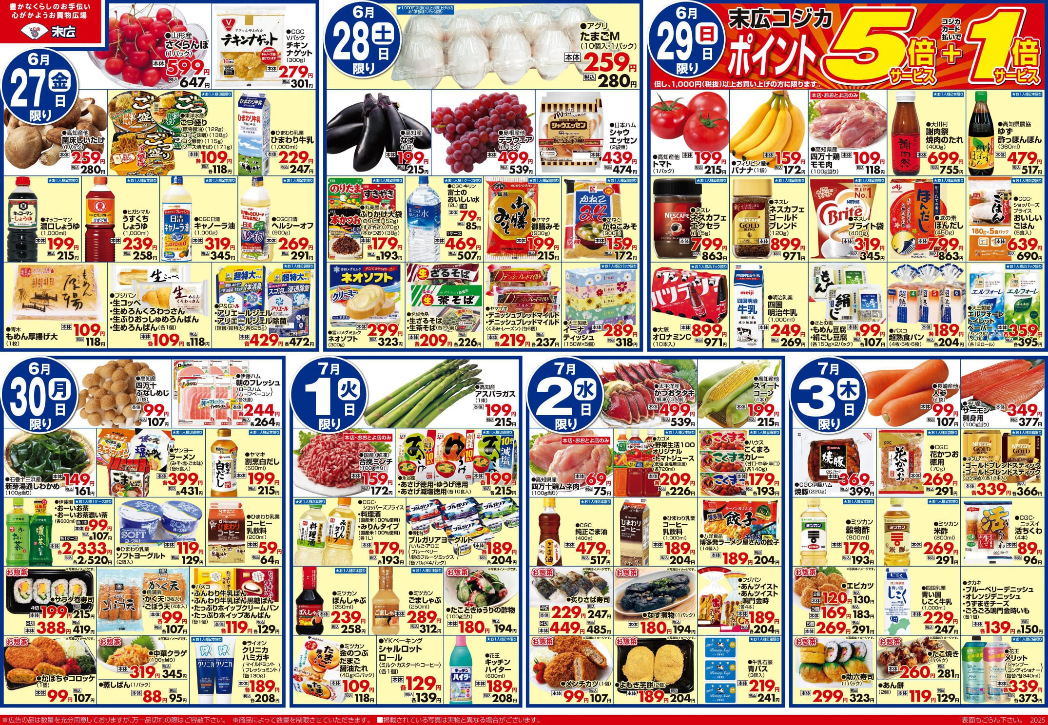 【末広チラシ情報】ネットでチラシを確認できます。 6月27日~7月3日のチラシは「おうちで半年忘年会 牛肩ロースステーキ 291円」 詳細版PDFはこちら(1.5MB) チラシ情報 この記事が気に入ったら いいね または フォローしてね! Follow @suehiloya Follow Me よかったらシェアしてね! URLをコピーしました! URLをコピーしました! 女性セブン(25年6月26日号)で、「田舎寿司のもと」が紹介されました! 7月4日~7月10日のチラシは「大創業祭第1弾 カレーVSアジアン 牛プルコギジャンボパック 971円」 関連記事 9月5日~9月11日のチラシは「秋のうまかもん祭り 本マグロ刺身用 755円」 2025年9月4日 8月29日~9月4日のチラシは「家計応援! 総力祭 トラウトサーモン 215円」 2025年8月28日 8月22日~8月28日のチラシは「初秋の味わい・秋の新商品 生さんま1尾 215円」 2025年8月21日 8月15日~8月21日のチラシは「夏のスタミナ飯特集 北海道産 無添加ほっけ開き 410円」 2025年8月14日 仕出しのメニューを更新しました。(2025年8月) 2025年8月8日 8月8日~8月14日のチラシは「お盆のごちそう 海鮮BBQセット 863円」 2025年8月7日 8月1日~8月7日のチラシは「家計応援総力祭 バナメイエビメガパック 1,058円」 2025年7月31日 7月25日~7月31日のチラシは「お庭でBBQ・おうちでごちそう 牛肩ロースステーキ(100g) 269円」 2025年7月24日