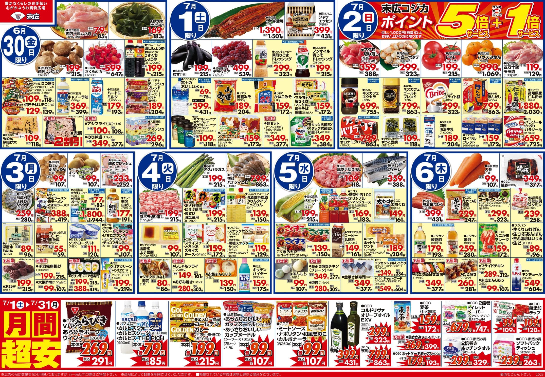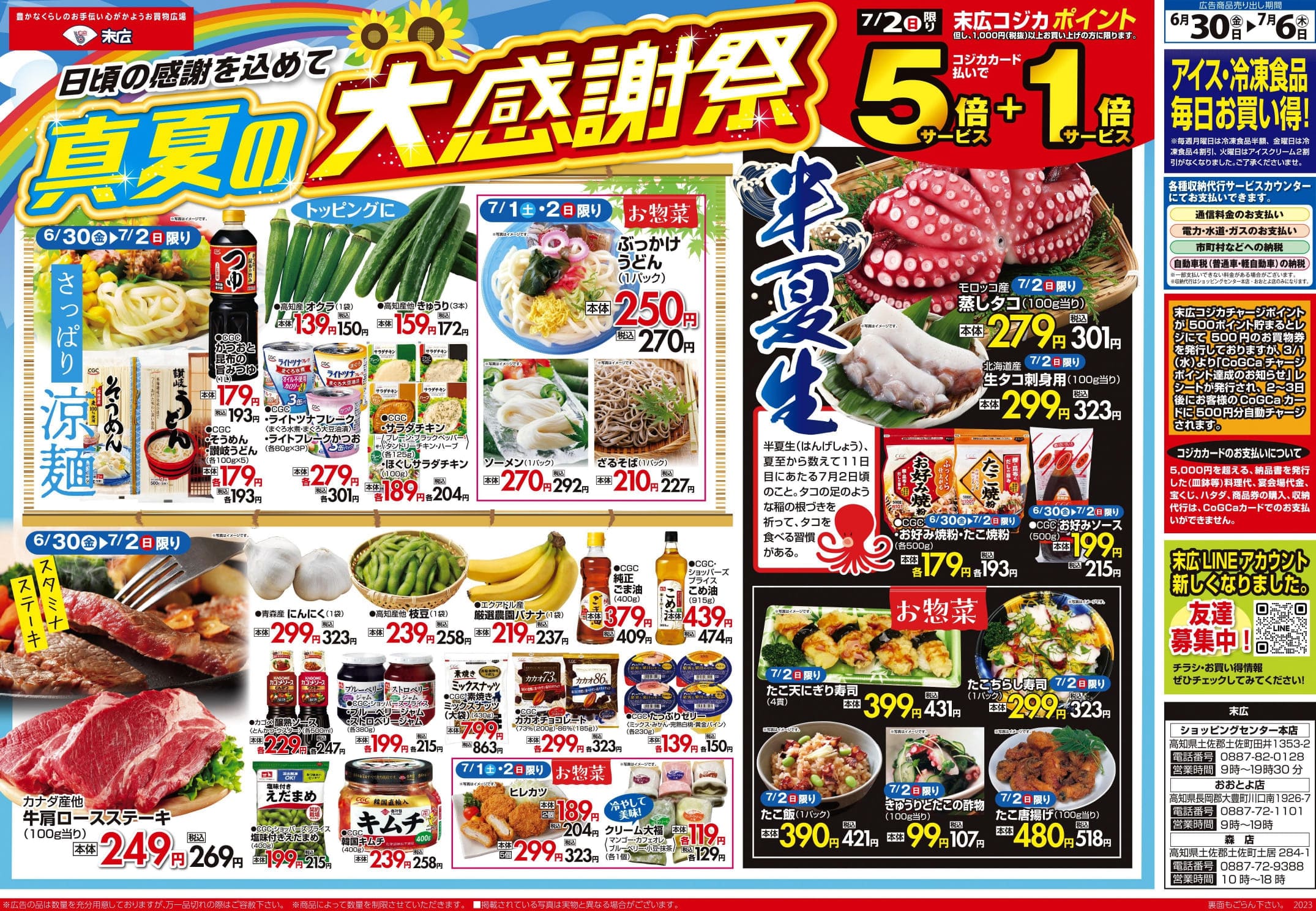 【末広チラシ情報】ネットでチラシを確認できます。 6月30日~7月6日のチラシは「真夏の大感謝祭 蒸しタコ 301円」 詳細版PDFはこちら(1.0MB) チラシ情報 この記事が気に入ったら いいね または フォローしてね! Follow @suehiloya Follow Me よかったらシェアしてね! URLをコピーしました! URLをコピーしました! 6月23日~6月29日のチラシは「オープン記念大特価!豚ロース切り落とし 107円」 商品出荷後のお届け先変更時の運賃発生について 関連記事 10月31日~11月6日のチラシは「月初めの市 バナメイエビ 215円」 2025年10月30日 株式会社末広のHPがリニューアルしました 2025年10月30日 10月24日~10月30日のチラシは「おうちでハロウィンしよ サーモン刺身用 388円」 2025年10月23日 10月17日~10月23日のチラシは「秋の土用スタミナメニュー 生さんま 626円」 2025年10月16日 高知新聞で「田舎寿司せっと」が紹介されました! 2025年10月16日 9月5日~9月11日のチラシは「秋のうまかもん祭り 本マグロ刺身用 755円」 2025年9月4日 8月29日~9月4日のチラシは「家計応援! 総力祭 トラウトサーモン 215円」 2025年8月28日 8月22日~8月28日のチラシは「初秋の味わい・秋の新商品 生さんま1尾 215円」 2025年8月21日