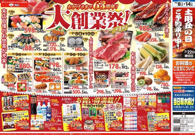 【末広チラシ情報】ネットでチラシを確認できます。 7月8日から7月14日のチラシは「おかげさまで63周年!大創業祭!うなぎ蒲焼1,058円」 http://ow.ly/tLP350JQmbG 簡易版jpg(123kB)、 http://ow.ly/9tmU50JQmbF 詳細版pdf(5.3MB) チラシ情報 この記事が気に入ったら いいね または フォローしてね! Follow @suehiloya Follow Me よかったらシェアしてね! URLをコピーしました! URLをコピーしました! 北海道フェア-2022年7月15日ビアホール開宴! 7月15日から7月17日のチラシは「お庭でBBQフェア。四万十鶏焼肉用138円」 関連記事 10月31日~11月6日のチラシは「月初めの市 バナメイエビ 215円」 2025年10月30日 株式会社末広のHPがリニューアルしました 2025年10月30日 10月24日~10月30日のチラシは「おうちでハロウィンしよ サーモン刺身用 388円」 2025年10月23日 10月17日~10月23日のチラシは「秋の土用スタミナメニュー 生さんま 626円」 2025年10月16日 高知新聞で「田舎寿司せっと」が紹介されました! 2025年10月16日 9月5日~9月11日のチラシは「秋のうまかもん祭り 本マグロ刺身用 755円」 2025年9月4日 8月29日~9月4日のチラシは「家計応援! 総力祭 トラウトサーモン 215円」 2025年8月28日 8月22日~8月28日のチラシは「初秋の味わい・秋の新商品 生さんま1尾 215円」 2025年8月21日