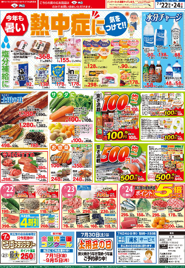 7月22日から7月24日のチラシは「熱中症に気をつけて。塩分補給に。紀州南高梅368円」