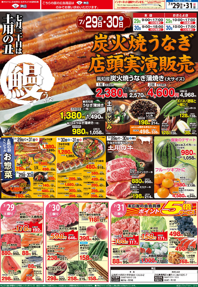 7月29日から7月31日のチラシは「七月三十日は土用の丑。炭火焼きうなぎ店頭実演販売2,380円」