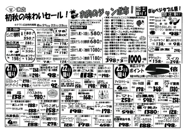 【末広チラシ情報】ネットでチラシを確認できます。 8月21日から8月23日のチラシは「初秋の味わいセール!ヒレカツ巻寿司180円」 http://ow.ly/Ea9E50B1Szm pdf(186kB) チラシ情報 この記事が気に入ったら いいね または フォローしてね! Follow @suehiloya Follow Me よかったらシェアしてね! URLをコピーしました! URLをコピーしました! 「情報プラットホーム8月号」に嶺北まるごとれいほくピザが紹介されています。 レタスクラブの「食」レポートに掲載されました 関連記事 9月5日~9月11日のチラシは「秋のうまかもん祭り 本マグロ刺身用 755円」 2025年9月4日 8月29日~9月4日のチラシは「家計応援! 総力祭 トラウトサーモン 215円」 2025年8月28日 8月22日~8月28日のチラシは「初秋の味わい・秋の新商品 生さんま1尾 215円」 2025年8月21日 8月15日~8月21日のチラシは「夏のスタミナ飯特集 北海道産 無添加ほっけ開き 410円」 2025年8月14日 仕出しのメニューを更新しました。(2025年8月) 2025年8月8日 8月8日~8月14日のチラシは「お盆のごちそう 海鮮BBQセット 863円」 2025年8月7日 8月1日~8月7日のチラシは「家計応援総力祭 バナメイエビメガパック 1,058円」 2025年7月31日 7月25日~7月31日のチラシは「お庭でBBQ・おうちでごちそう 牛肩ロースステーキ(100g) 269円」 2025年7月24日