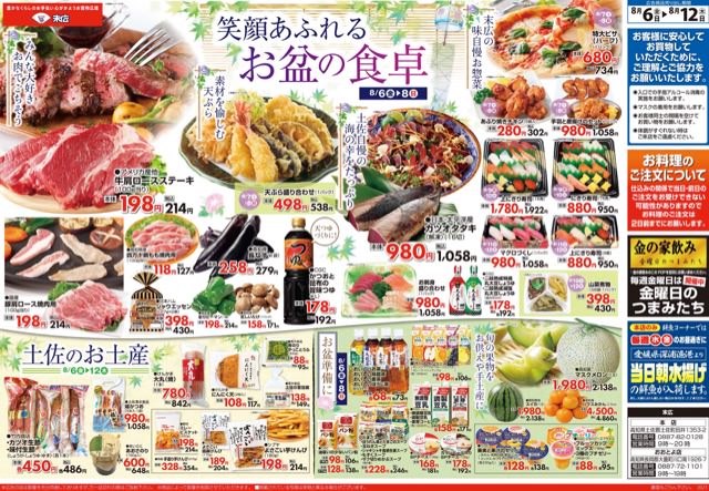 8月6日から8月12日のチラシは「笑顔溢れるお盆の食卓。天ぷら盛り合わせ538円」