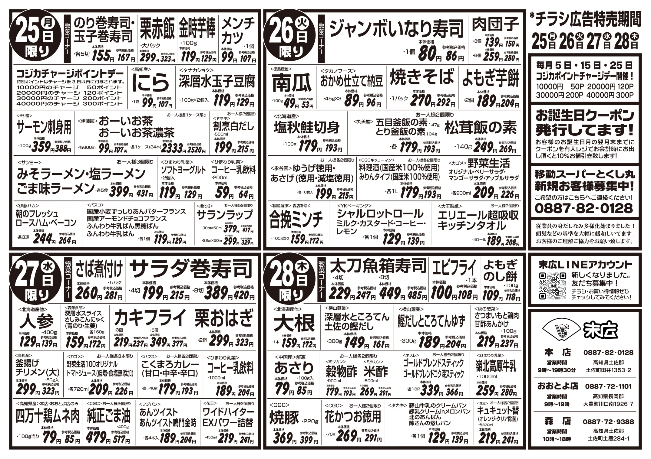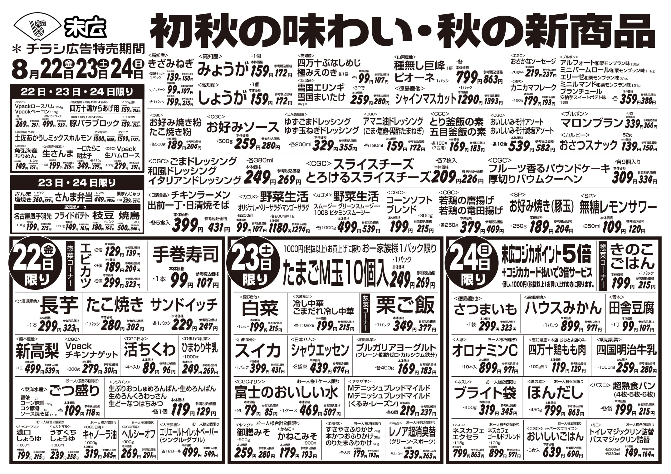 【末広チラシ情報】ネットでチラシを確認できます。 8月22日~8月28日のチラシは「初秋の味わい・秋の新商品 生さんま1尾 215円」 詳細版PDFはこちら(1.5MB) チラシ情報 この記事が気に入ったら いいね または フォローしてね! Follow @suehiloya Follow Me よかったらシェアしてね! URLをコピーしました! URLをコピーしました! 8月15日~8月21日のチラシは「夏のスタミナ飯特集 北海道産 無添加ほっけ開き 410円」 8月29日~9月4日のチラシは「家計応援! 総力祭 トラウトサーモン 215円」 関連記事 9月5日~9月11日のチラシは「秋のうまかもん祭り 本マグロ刺身用 755円」 2025年9月4日 8月29日~9月4日のチラシは「家計応援! 総力祭 トラウトサーモン 215円」 2025年8月28日 8月15日~8月21日のチラシは「夏のスタミナ飯特集 北海道産 無添加ほっけ開き 410円」 2025年8月14日 仕出しのメニューを更新しました。(2025年8月) 2025年8月8日 8月8日~8月14日のチラシは「お盆のごちそう 海鮮BBQセット 863円」 2025年8月7日 8月1日~8月7日のチラシは「家計応援総力祭 バナメイエビメガパック 1,058円」 2025年7月31日 7月25日~7月31日のチラシは「お庭でBBQ・おうちでごちそう 牛肩ロースステーキ(100g) 269円」 2025年7月24日 7月18日~7月24日のチラシは「大創業祭 第2弾 国産うなぎ蒲焼 2,365円」 2025年7月17日