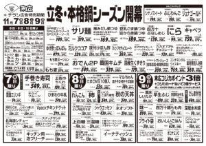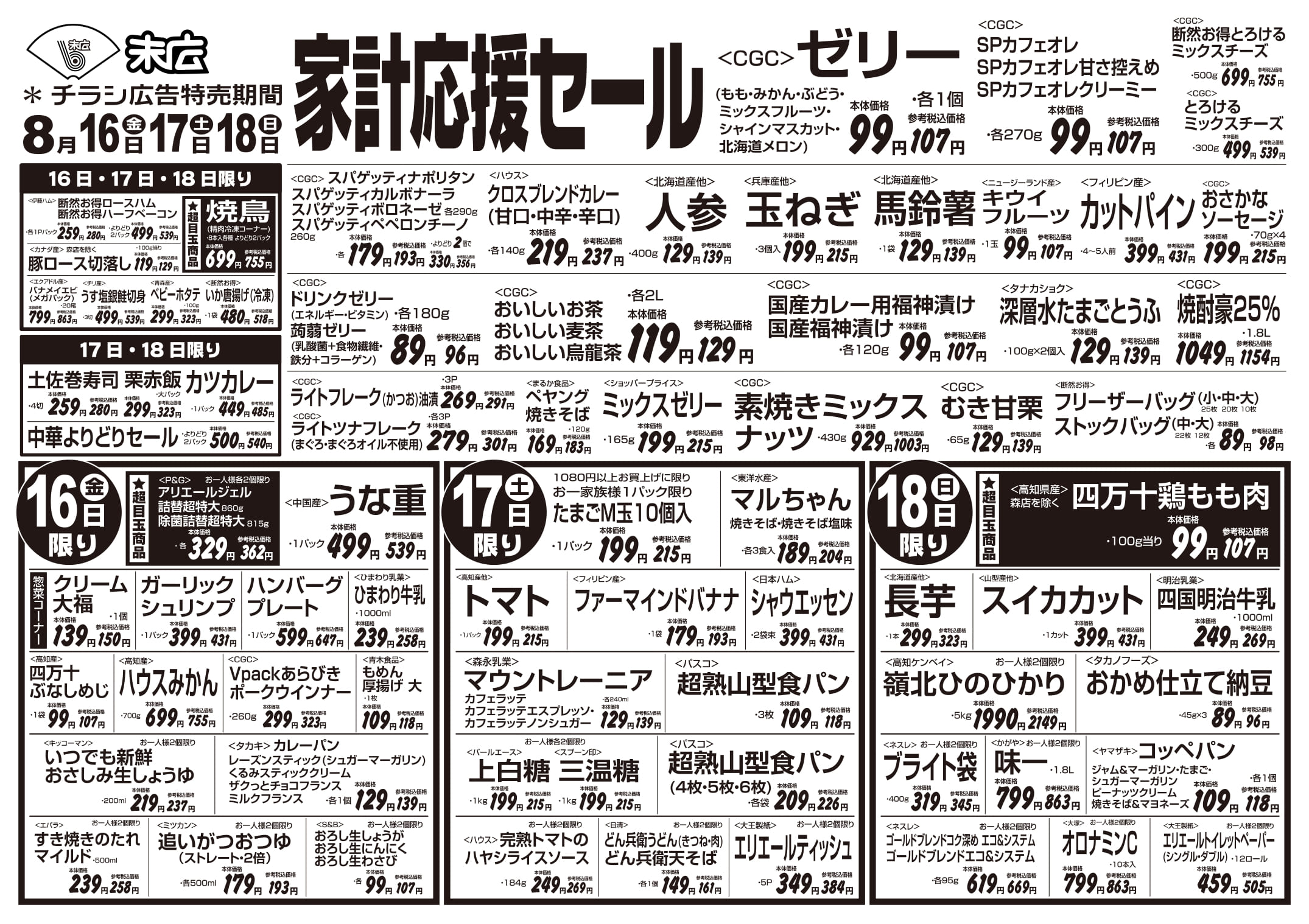 【末広チラシ情報】ネットでチラシを確認できます。 8月16日~8月22日のチラシは「家計応援セール 焼鳥 755円」 詳細版PDFはこちら(1.5MB) チラシ情報 この記事が気に入ったら いいね または フォローしてね! Follow @suehiloya Follow Me よかったらシェアしてね! URLをコピーしました! URLをコピーしました! 8月9日~8月15日のチラシは「お盆のおもてなし 高知産マスクメロン 2149円」 8月23日~8月29日のチラシは「初秋の味わい 生さんま 215円」 関連記事 11月7日~11月13日のチラシは「本格鍋シーズン開幕 鯛切身(鍋用) 539 円」 2025年11月6日 露地文旦のチラシが完成しました! 2025年11月5日 2026すえひろ屋果物の定期便&季節の果物 2025年11月5日 2025すえひろ屋のおせちカタログです! 2025年11月5日 2025すえひろ屋年末カタログ完成いたしました! 2025年11月5日 2025クリスマスケーキのチラシが完成しました! 2025年11月5日 10月31日~11月6日のチラシは「月初めの市 バナメイエビ 215円」 2025年10月30日 株式会社末広のHPがリニューアルしました 2025年10月30日