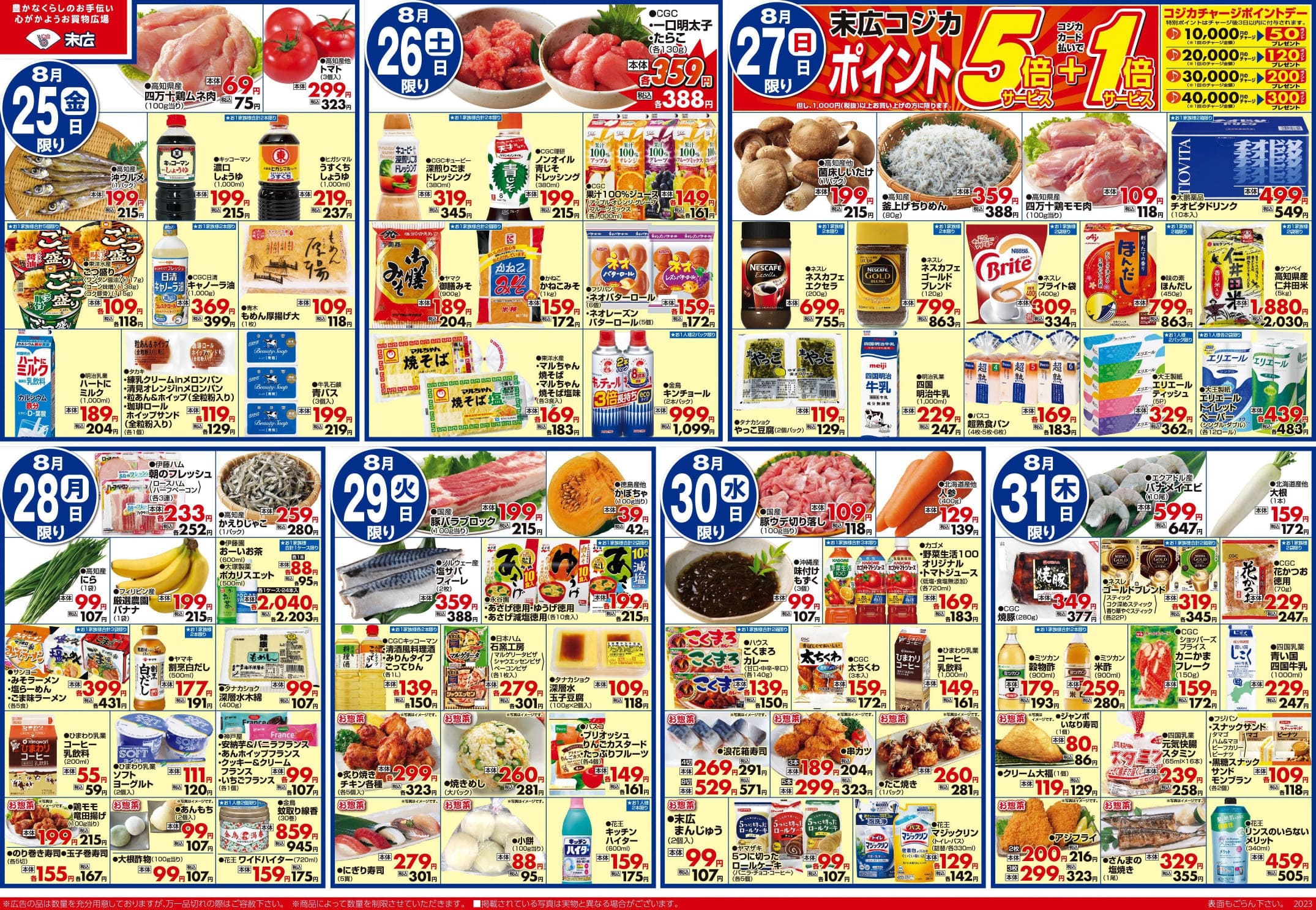 【末広チラシ情報】ネットでチラシを確認できます。 8月25日~8月31日のチラシは「初秋の味わい 生サンマ<解凍> 280円」 詳細版PDFはこちら(1.5MB) チラシ情報 この記事が気に入ったら いいね または フォローしてね! Follow @suehiloya Follow Me よかったらシェアしてね! URLをコピーしました! URLをコピーしました! 8月18日~8月24日のチラシは「家計応援セール CGCカレールー各種 107円」 9月1日~9月7日のチラシは「月初めの市 高知産養殖ブリ切身 388円」 関連記事 10月31日~11月6日のチラシは「月初めの市 バナメイエビ 215円」 2025年10月30日 株式会社末広のHPがリニューアルしました 2025年10月30日 10月24日~10月30日のチラシは「おうちでハロウィンしよ サーモン刺身用 388円」 2025年10月23日 10月17日~10月23日のチラシは「秋の土用スタミナメニュー 生さんま 626円」 2025年10月16日 高知新聞で「田舎寿司せっと」が紹介されました! 2025年10月16日 9月5日~9月11日のチラシは「秋のうまかもん祭り 本マグロ刺身用 755円」 2025年9月4日 8月29日~9月4日のチラシは「家計応援! 総力祭 トラウトサーモン 215円」 2025年8月28日 8月22日~8月28日のチラシは「初秋の味わい・秋の新商品 生さんま1尾 215円」 2025年8月21日