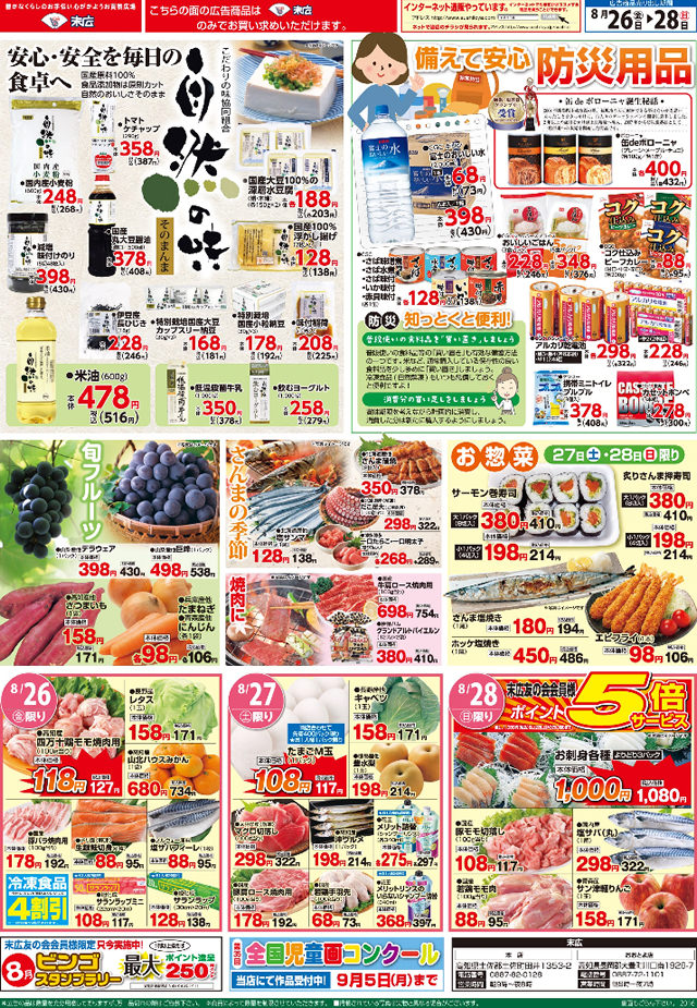 8月26日から8月28日のチラシは「安心・安全を毎日の食卓へ。国内産小麦粉248円」