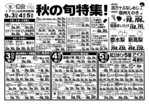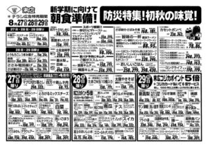 8月27日から8月29日のチラシは「新学期に向けて朝食準備!防災特集!初秋の味覚!さんま弁当486円」