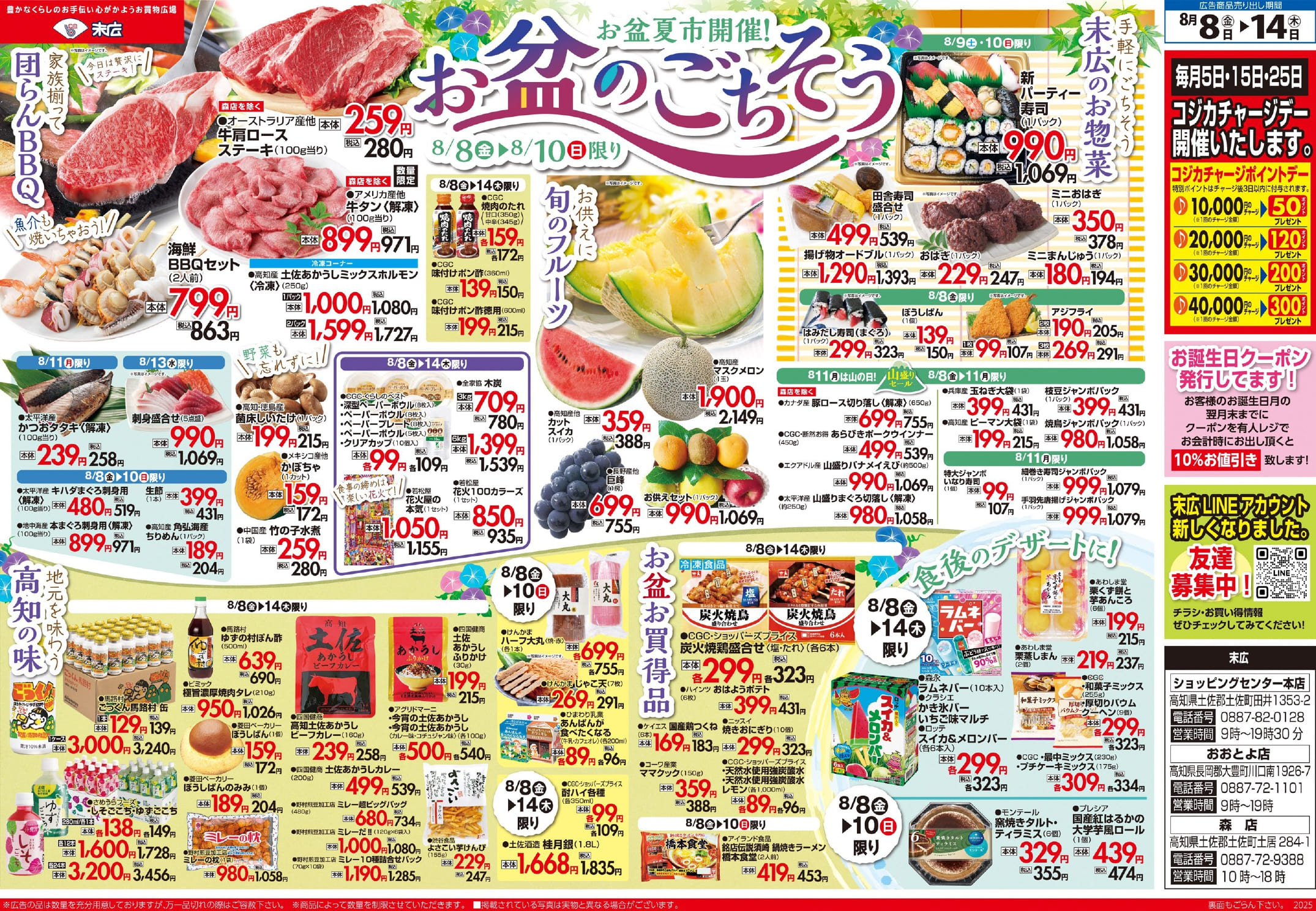 【末広チラシ情報】ネットでチラシを確認できます。 8月8日~8月14日のチラシは「お盆のごちそう 海鮮BBQセット 863円」 詳細版PDFはこちら(1.5MB) チラシ情報 この記事が気に入ったら いいね または フォローしてね! Follow @suehiloya Follow Me よかったらシェアしてね! URLをコピーしました! URLをコピーしました! 8月1日~8月7日のチラシは「家計応援総力祭 バナメイエビメガパック 1,058円」 仕出しのメニューを更新しました。(2025年8月) 関連記事 9月5日~9月11日のチラシは「秋のうまかもん祭り 本マグロ刺身用 755円」 2025年9月4日 8月29日~9月4日のチラシは「家計応援! 総力祭 トラウトサーモン 215円」 2025年8月28日 8月22日~8月28日のチラシは「初秋の味わい・秋の新商品 生さんま1尾 215円」 2025年8月21日 8月15日~8月21日のチラシは「夏のスタミナ飯特集 北海道産 無添加ほっけ開き 410円」 2025年8月14日 仕出しのメニューを更新しました。(2025年8月) 2025年8月8日 8月1日~8月7日のチラシは「家計応援総力祭 バナメイエビメガパック 1,058円」 2025年7月31日 7月25日~7月31日のチラシは「お庭でBBQ・おうちでごちそう 牛肩ロースステーキ(100g) 269円」 2025年7月24日 7月18日~7月24日のチラシは「大創業祭 第2弾 国産うなぎ蒲焼 2,365円」 2025年7月17日