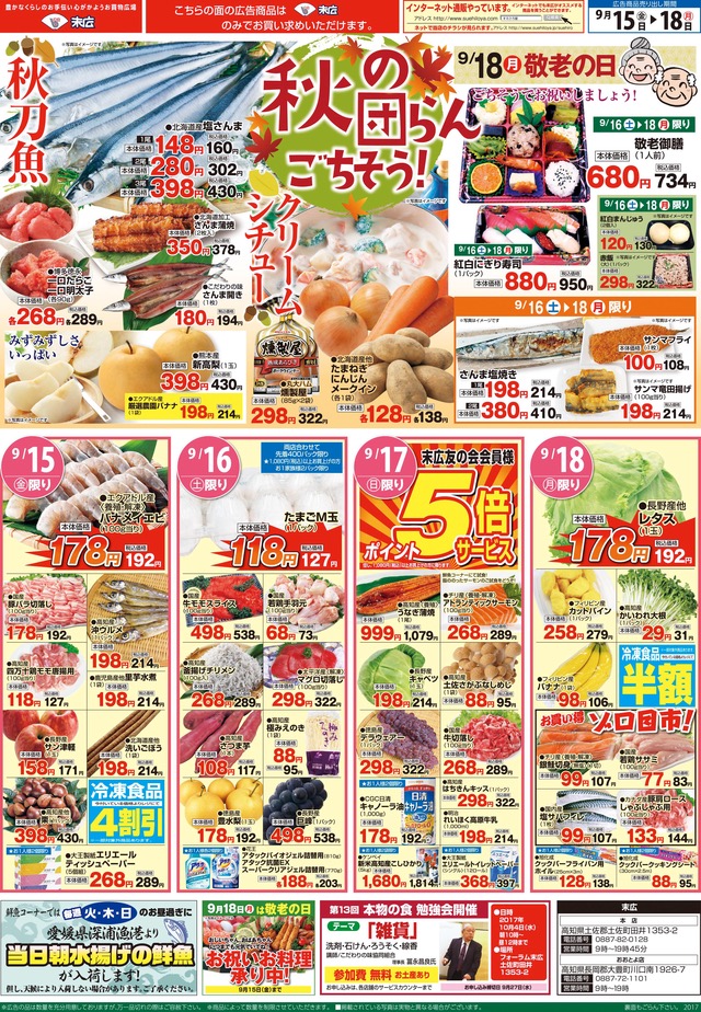 9月15日から9月18日のチラシは「秋の団らんごちそう。北海道産塩さんま148円」