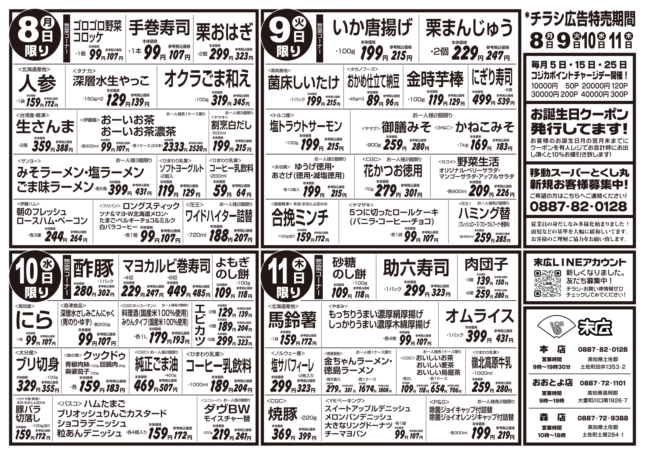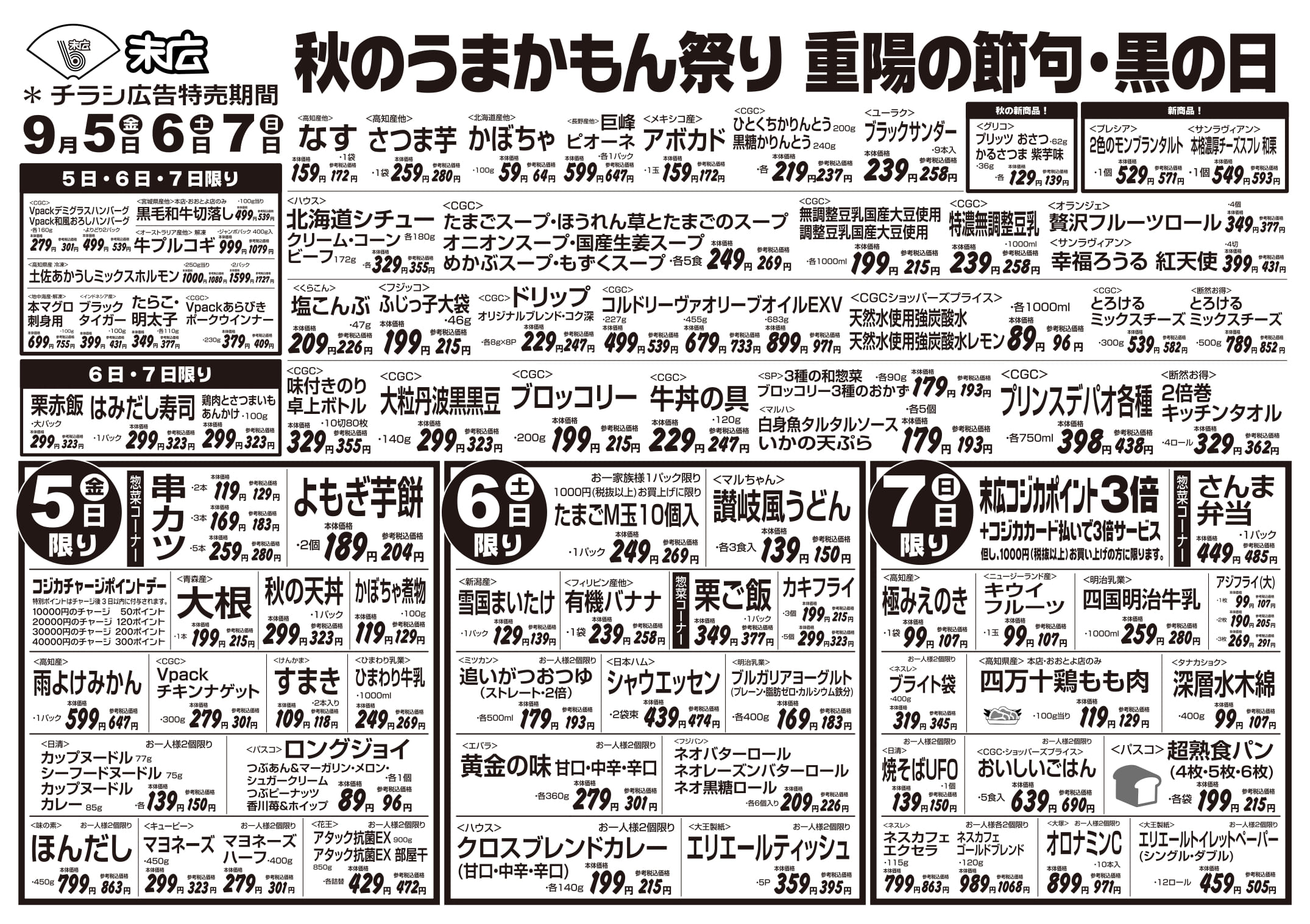 【末広チラシ情報】ネットでチラシを確認できます。 9月5日~9月11日のチラシは「秋のうまかもん祭り 本マグロ刺身用 755円」 詳細版PDFはこちら(1.5MB) チラシ情報 この記事が気に入ったら いいね または フォローしてね! Follow @suehiloya Follow Me よかったらシェアしてね! URLをコピーしました! URLをコピーしました! 8月29日~9月4日のチラシは「家計応援! 総力祭 トラウトサーモン 215円」 関連記事 8月29日~9月4日のチラシは「家計応援! 総力祭 トラウトサーモン 215円」 2025年8月28日 8月22日~8月28日のチラシは「初秋の味わい・秋の新商品 生さんま1尾 215円」 2025年8月21日 8月15日~8月21日のチラシは「夏のスタミナ飯特集 北海道産 無添加ほっけ開き 410円」 2025年8月14日 仕出しのメニューを更新しました。(2025年8月) 2025年8月8日 8月8日~8月14日のチラシは「お盆のごちそう 海鮮BBQセット 863円」 2025年8月7日 8月1日~8月7日のチラシは「家計応援総力祭 バナメイエビメガパック 1,058円」 2025年7月31日 7月25日~7月31日のチラシは「お庭でBBQ・おうちでごちそう 牛肩ロースステーキ(100g) 269円」 2025年7月24日 7月18日~7月24日のチラシは「大創業祭 第2弾 国産うなぎ蒲焼 2,365円」 2025年7月17日