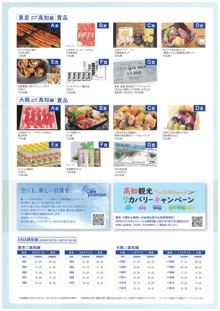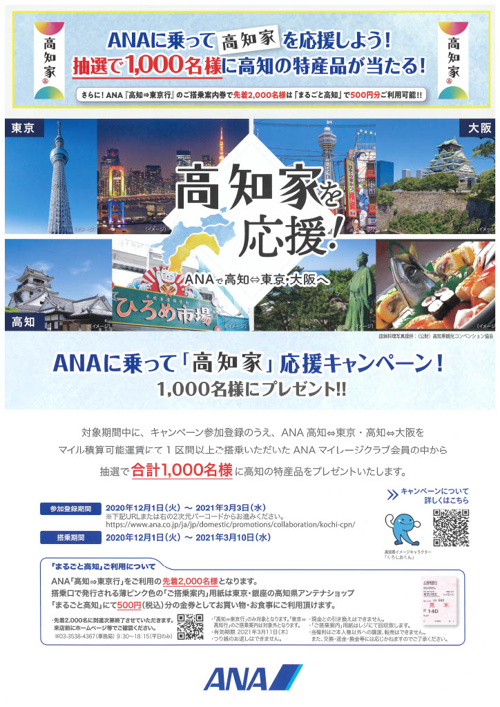 対象期間中に、キャンペーン参加登録のうえ、ANA高知・東京間、高知・大阪間を