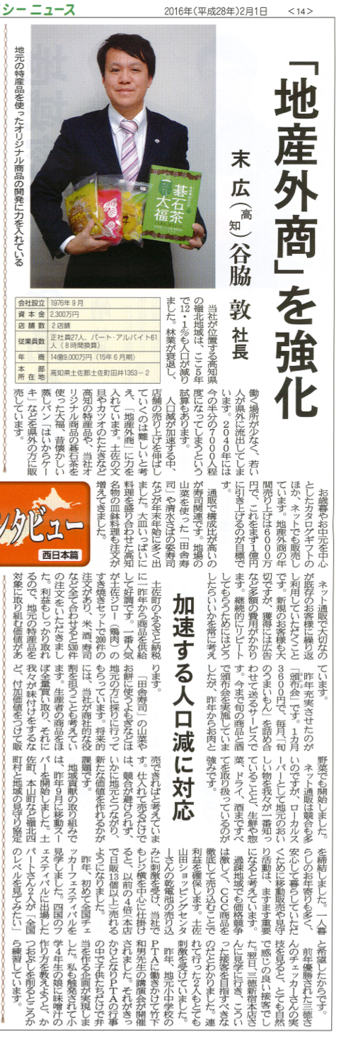 CGCニュース第461号(2016年2月号)にCGC加盟企業トップインタビューに末広が紹介されました。西日本のCGC企業24社のトップ挨拶が掲載されています。 メディア掲載 この記事が気に入ったら いいね または フォローしてね! Follow @suehiloya Follow Me よかったらシェアしてね! URLをコピーしました! URLをコピーしました! 高知新聞2016年2月9日付朝刊に、第34回全国児童画コンクールの表彰式の様子が掲載されました。 今日のチラシは「肉のジャンボ市。牛肉、豚肉、鶏肉、よりどり3パック1,000円」 関連記事 高知新聞で「田舎寿司せっと」が紹介されました! 2025年10月16日 9月5日~9月11日のチラシは「秋のうまかもん祭り 本マグロ刺身用 755円」 2025年9月4日 8月29日~9月4日のチラシは「家計応援! 総力祭 トラウトサーモン 215円」 2025年8月28日 8月22日~8月28日のチラシは「初秋の味わい・秋の新商品 生さんま1尾 215円」 2025年8月21日 8月15日~8月21日のチラシは「夏のスタミナ飯特集 北海道産 無添加ほっけ開き 410円」 2025年8月14日 仕出しのメニューを更新しました。(2025年8月) 2025年8月8日 8月8日~8月14日のチラシは「お盆のごちそう 海鮮BBQセット 863円」 2025年8月7日 8月1日~8月7日のチラシは「家計応援総力祭 バナメイエビメガパック 1,058円」 2025年7月31日