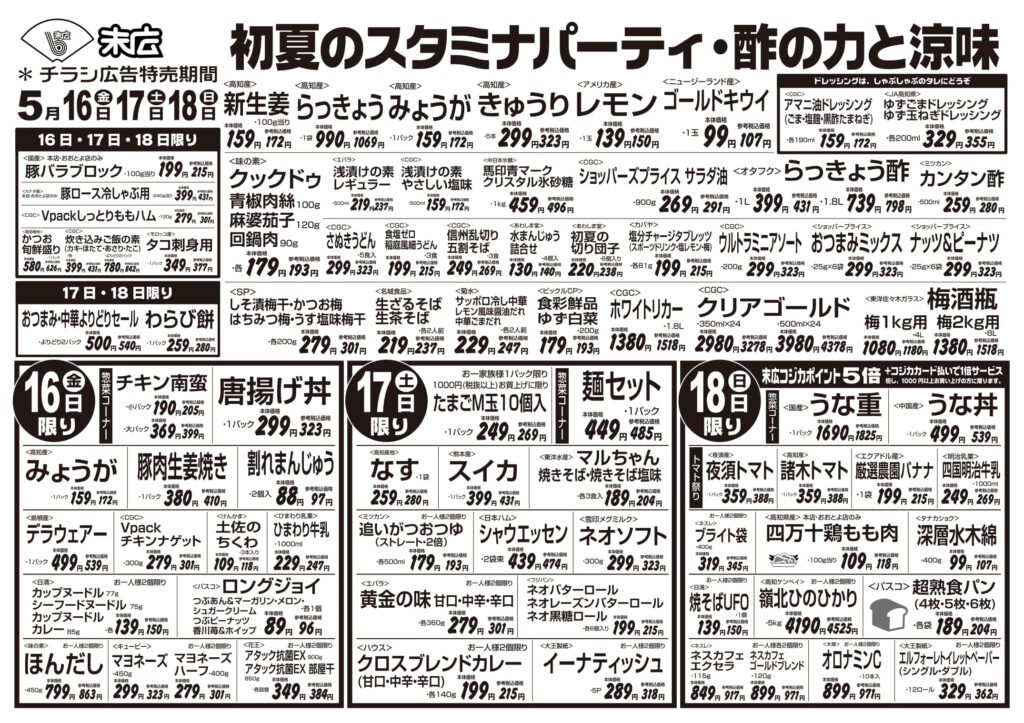 【末広チラシ情報】ネットでチラシを確認できます。 5月16日~5月22日のチラシは「初夏のスタミナパーティ タコ刺身用 377円」 詳細版PDFはこちら(1.5MB) -