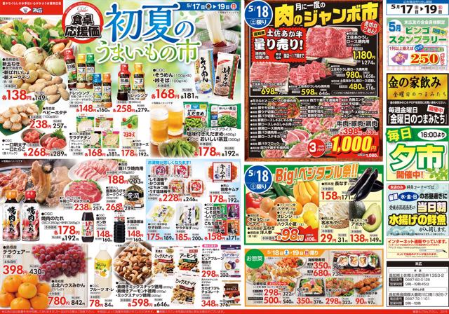 5月17日から5月19日のチラシは「食卓応援価。初夏のうまいもの市。塩味付きえだまめ178円」