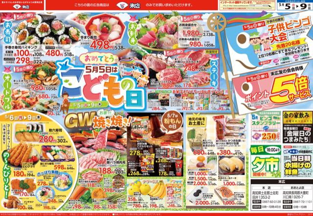 5月5日から5月9日のチラシは「おめでとう。5月5日はこどもの日。キッズオードブル980円」