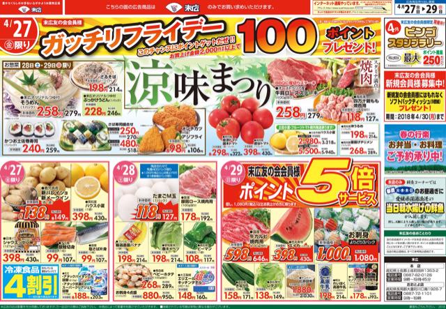 【末広チラシ情報】ネットでチラシを確認できます。 4月27日から4月29日のチラシは「涼味まつり。つゆ付きそうめん258円」 http://ow.ly/vdAP30jDNwh 簡易版jpg(99kB)、 http://ow.ly/sLiG30jDNqE 詳細版pdf(4.8MB)