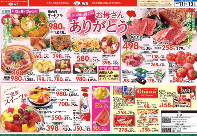 5月11日から5月13日のチラシは「5月13日(日)は母の日。母の日オードブル980円」