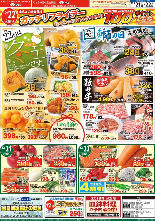 【末広チラシ情報】ネットでチラシを確認できます。 12月21日から12月22日のチラシは「22日は冬至です。高知県産ゆず38円」 http://ow.ly/d0ou30hhnZI 簡易版jpg(368kB)、 http://ow.ly/Q09W30hhnYk 詳細版pdf(3.2MB) -