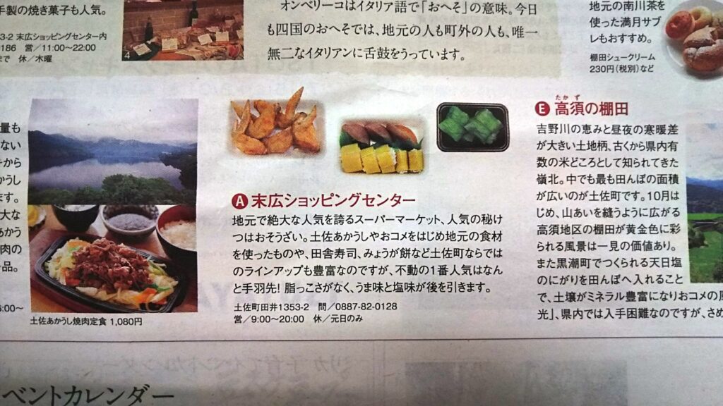 2016年7月14日発行のミリカ7月号に 当社末広ショッピングセンターが掲載されました。 14ページ「あの町!この村!地ネタめぐり」のコーナーで 末広のある土佐町が紹介されております。 末広ショッピングセンターと一緒に、店舗となりにある イタリ...