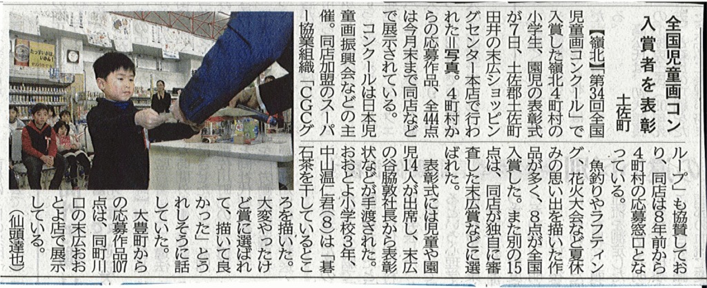 高知新聞2016年2月9日付朝刊に、第34回全国児童画コンクールの表彰式の様子が掲載されました。株式会社末広では8年前から全国児童画コンクールの応募窓口をしております。受賞された絵を含む全作品を、末広ショッピングセンター本店、おおとよ店の二店舗に... -