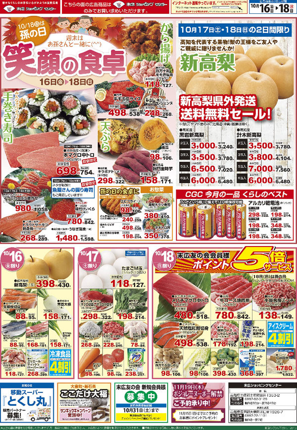 【末広チラシ情報】ネットでチラシを確認できます。今日のチラシは「10月18日は孫の日。笑顔の食卓。マグロたっぷり盛り合わせ980円」
