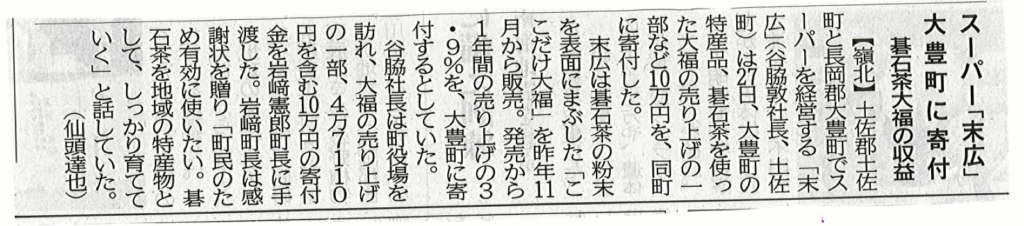 高知新聞2015年11月29日付朝刊に、ここだけ大福の売上の一部を大豊町に寄付が掲載されました。