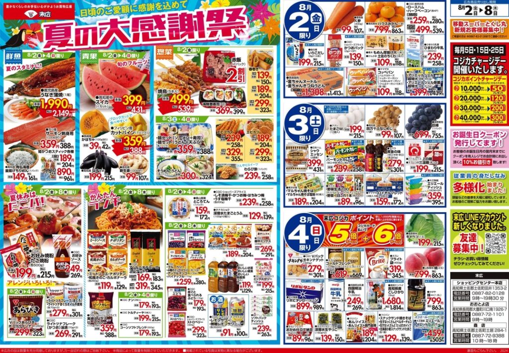 【末広チラシ情報】ネットでチラシを確認できます。 8月2日~8月8日のチラシは「夏の大感謝祭 高知産他スイカ 431円」 詳細版PDFはこちら(1.6MB)
