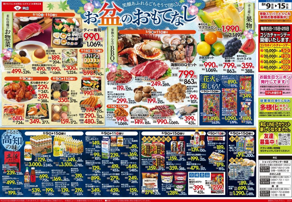 【末広チラシ情報】ネットでチラシを確認できます。 8月9日~8月15日のチラシは「お盆のおもてなし 高知産マスクメロン 2149円」 詳細版PDFはこちら(1.6MB) -