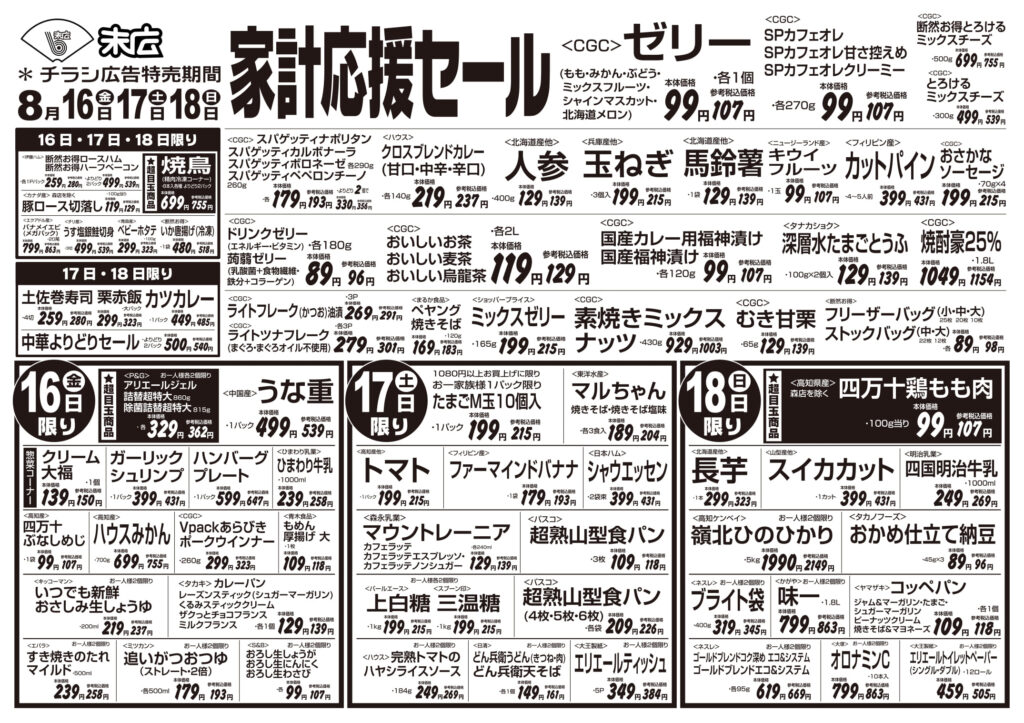 【末広チラシ情報】ネットでチラシを確認できます。 8月16日~8月22日のチラシは「家計応援セール 焼鳥 755円」 詳細版PDFはこちら(1.5MB) -