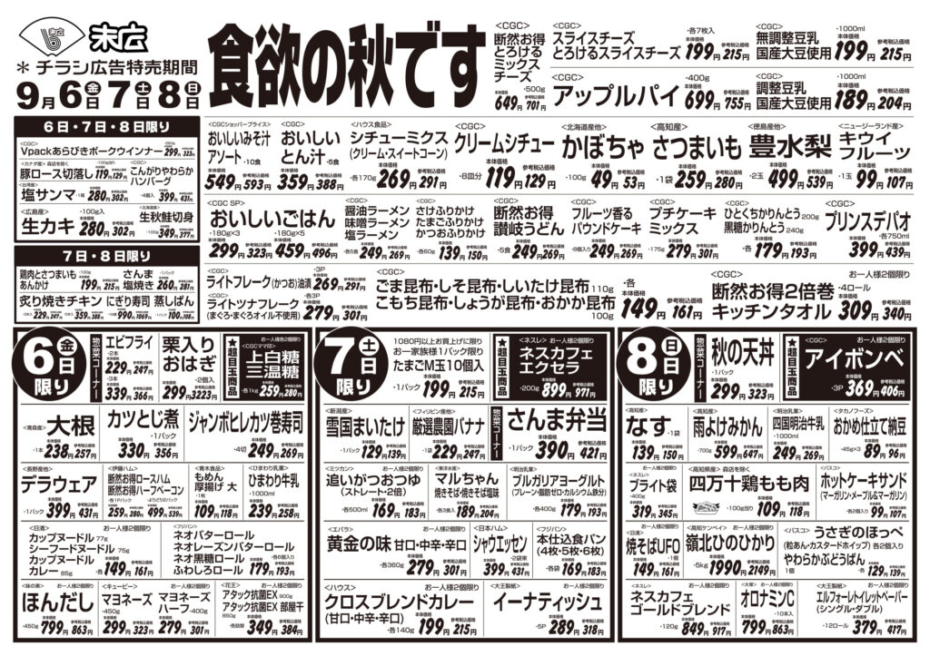 【末広チラシ情報】ネットでチラシを確認できます。 9月6日~9月12日のチラシは「食欲の秋です 生カキ 302円」 詳細版PDFはこちら(1.4MB) -