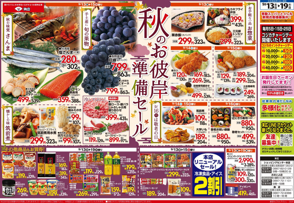【末広チラシ情報】ネットでチラシを確認できます。 9月13日~9月19日のチラシは「秋のお彼岸準備セール 巨峰 863円」 詳細版PDFはこちら(1.5MB) -
