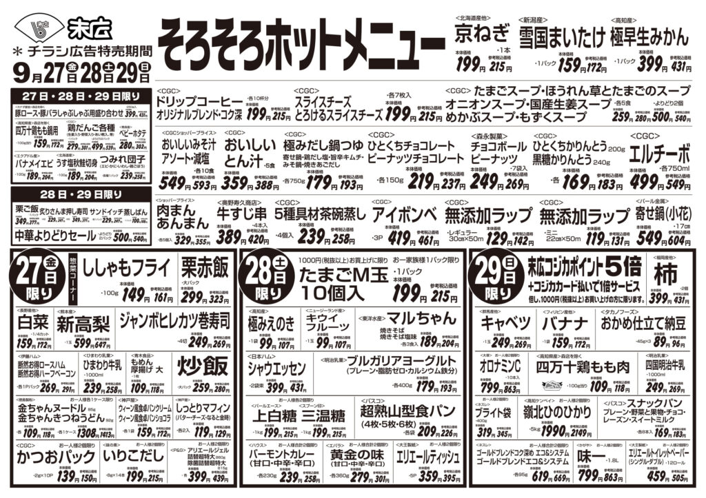 【末広チラシ情報】ネットでチラシを確認できます。 9月27日~10月3日のチラシは「そろそろホットメニュー 四万十鶏もも鍋用100g 172円」 詳細版PDFはこちら(1.5MB) -