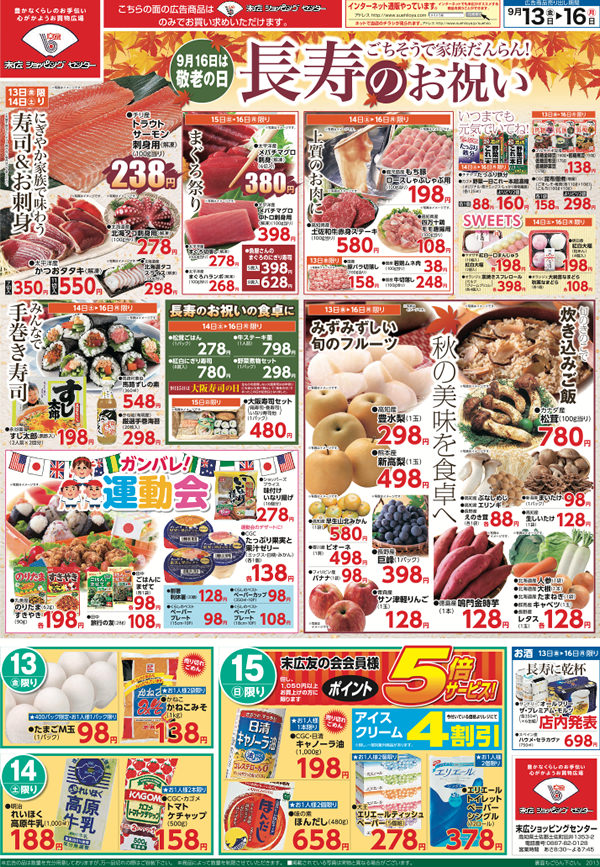 【末広チラシ情報】ネットでチラシを確認できます。 今日のチラシは「9月16日は敬老の日。ごちそうで家族団らん。トラウトサーモン刺身用238円」 http://ow.ly/oKZKJ 簡易版jpg(274kB)、 http://ow.ly/oKZJv 詳細版pdf(7.1MB) -