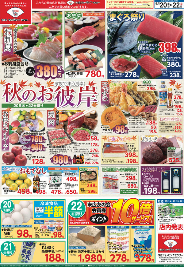 【末広チラシ情報】ネットでチラシを確認できます。 今日のチラシは「秋のお彼岸。お刺身盛り合わせ380円」 http://ow.ly/p0qSE 簡易版jpg(257kB)、 http://ow.ly/p0qRL 詳細版pdf(6.8MB) -
