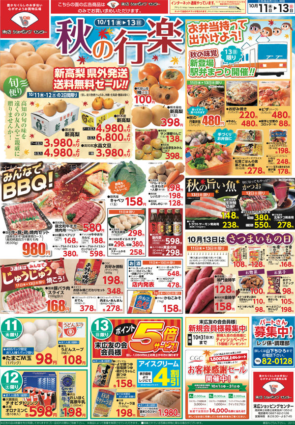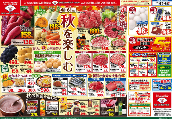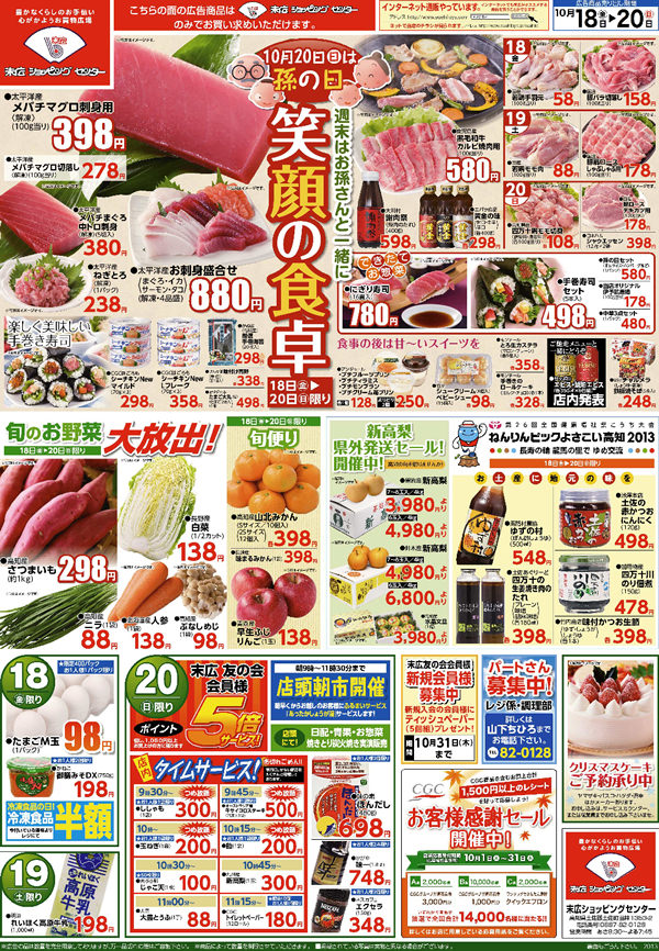 【末広チラシ情報】ネットでチラシを確認できます。 今日のチラシは「秋を楽しむ。高知産さつまいも158円」 http://ow.ly/ptNW8 簡易版jpg(154kB)、 http://ow.ly/ptNUG 詳細版pdf(3.5MB) -