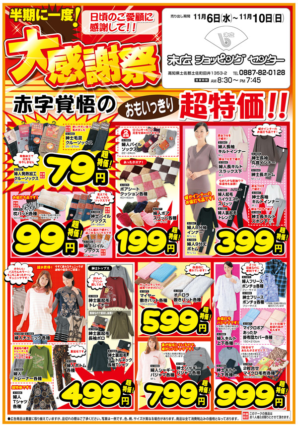 今日のチラシは「半期に一度。大感謝祭。婦人発熱加工クルーソックス79円」
