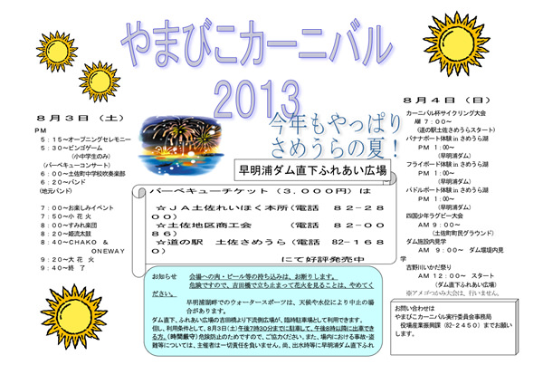 やまびこカーニバルが早明浦ダム直下で開催されます。 当店も末広ジュニア会(45歳まで社員で希望者による)で出店する予定です。 【日時】2013年8月3日(土)、4日(日) 【場所】早明浦ダム直下ふれあい広場 今年も生ビールに、鶏の炭火焼、手羽先などを販... -