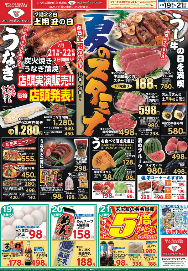 【末広チラシ情報】ネットでチラシを確認できます。 今日のチラシは「夏のスタミナ。高知産うなぎ蒲焼き1,280円」 http://ow.ly/mVuhU 簡易版jpg(262kB)、 http://ow.ly/mVufH 詳細版jpg(6.4MB) -
