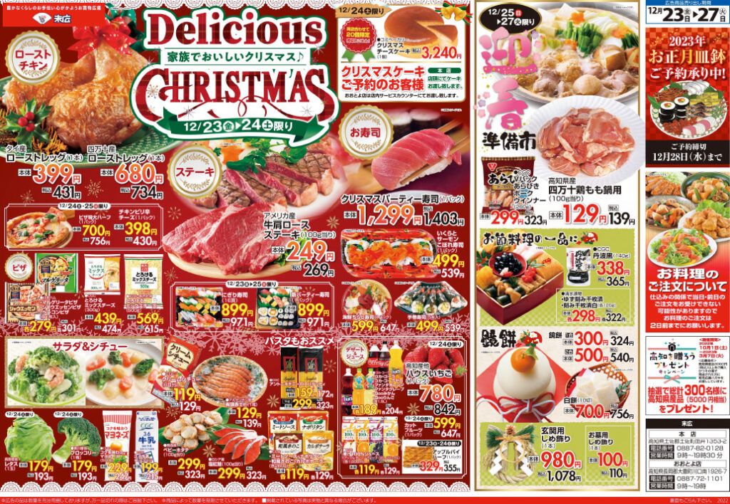 【末広チラシ情報】ネットでチラシを確認できます。 12月23日から12月24日のチラシは「家族でおいしいクリスマス♪クリスマスパーティ寿司1403円」 https://www.suehiloya.com/public/221223.jpg 簡易版jpg(656kB)、 https://www.suehiloya.com/public/2212... -