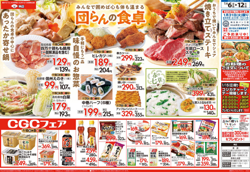 1月6日から1月8日のチラシは「団らんの食卓 四万十鶏もも鍋用139円」