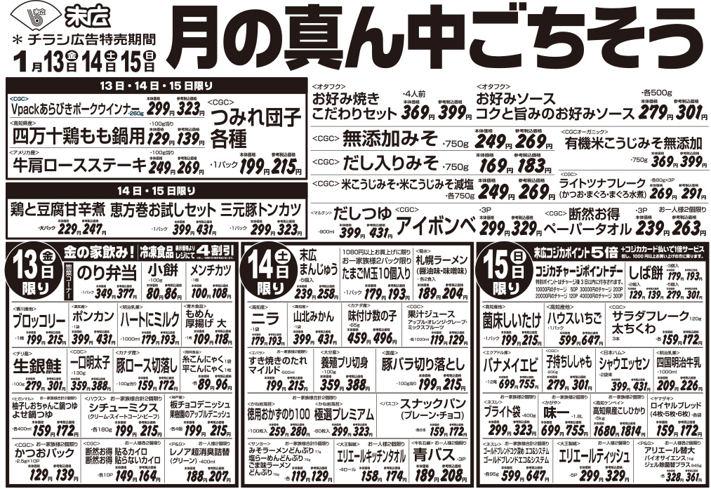 1月13日から1月15日のチラシは「月の真ん中ごちそう 四万十鶏もも鍋用139円」