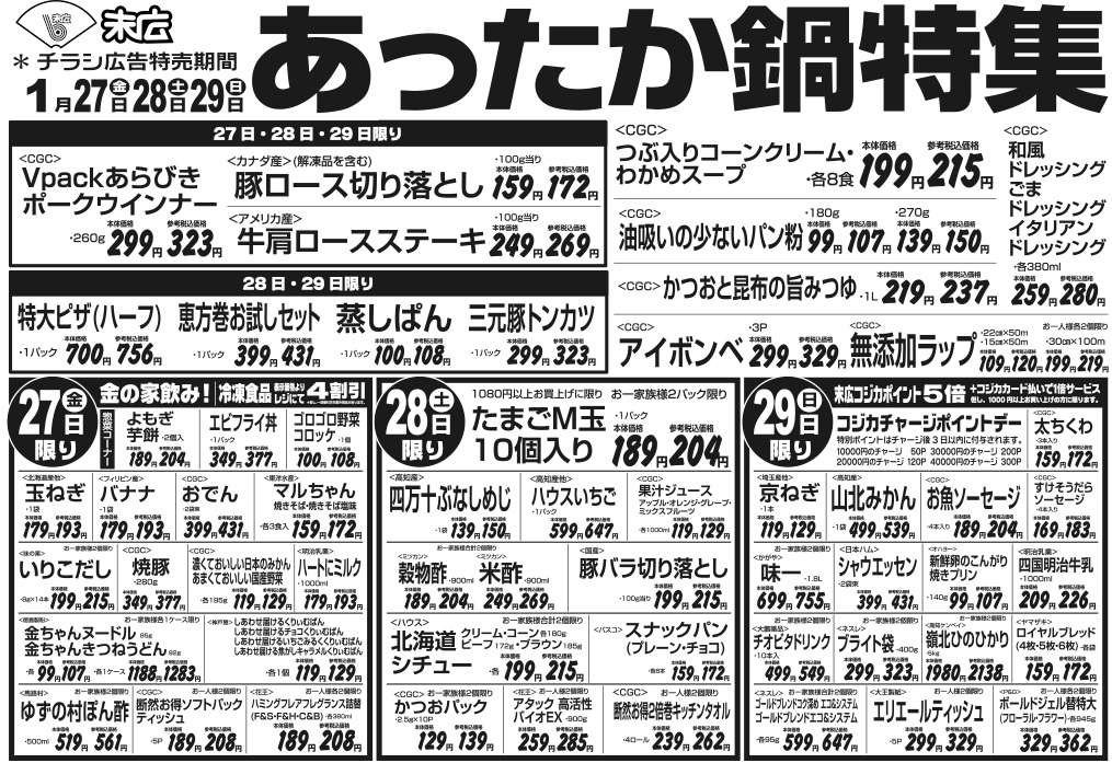 1月27日から1月29日のチラシは「あったか鍋特集 豚ロース切り落とし172円」